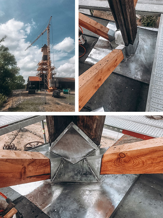Wir waren in den letzten Wochen am alten Luitpoldsprudel im Einsatz. 💪 Die Sanierung des Bohrturms durch die Zimmerei Fischer wurde von Koch Haustechnik unterstützt. Wir haben zusätzliche Versteifungen an den Balkendurchführungen eingefasst und wieder an die bestehende Dacheindeckung eingefalzt.